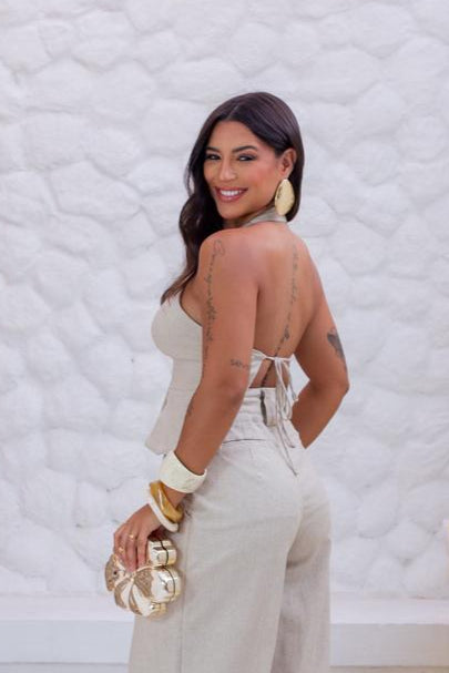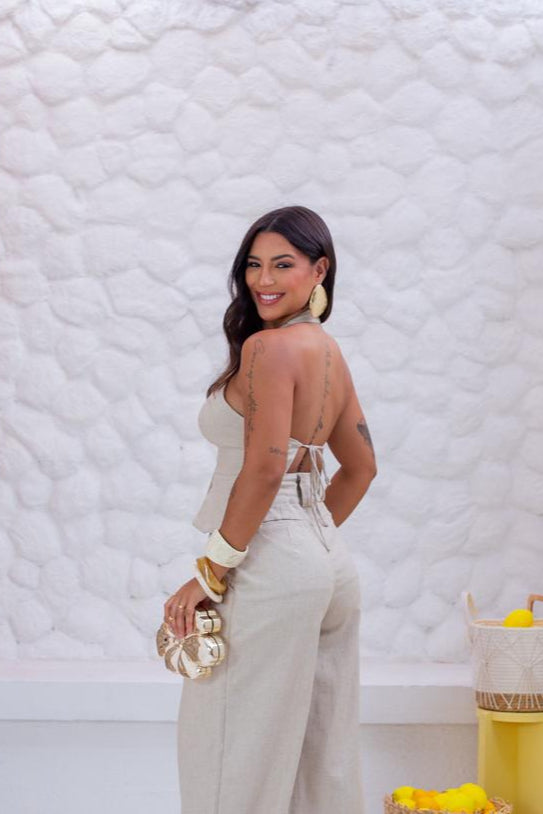 Colete de linho duplo , com bolso invisível pespontado , recorte pespontado no busto e amarração nas costas