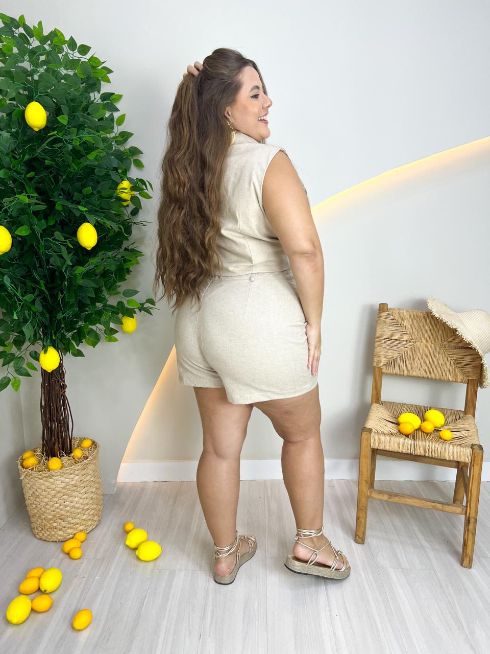 Conjunto de linho, short com recorte na frente, detalhe de fivela e pence nas costas. Colete com lapelas na altura do busto, pate com botões, golinha e pence nas costas