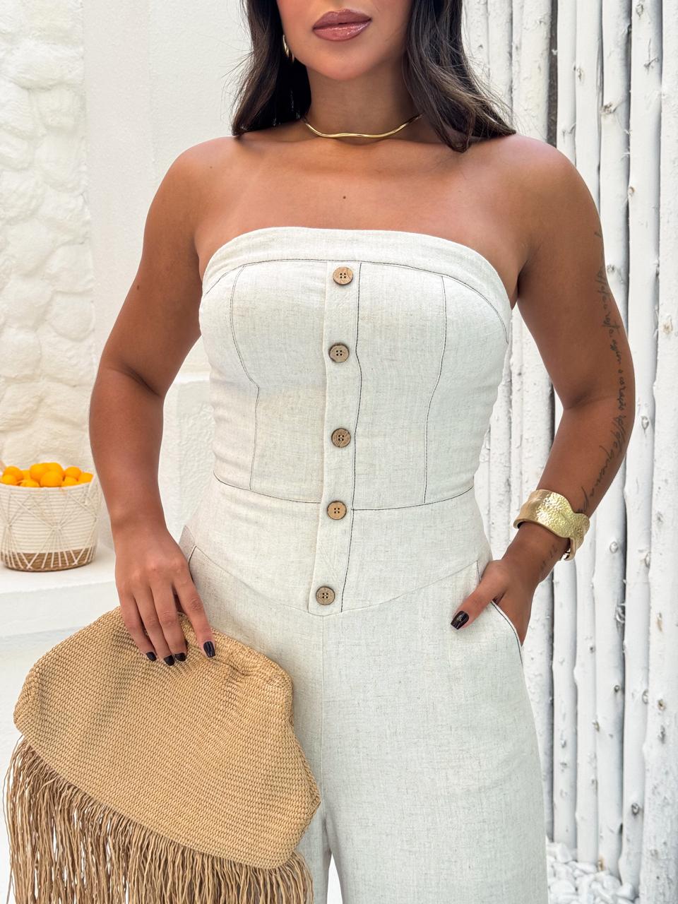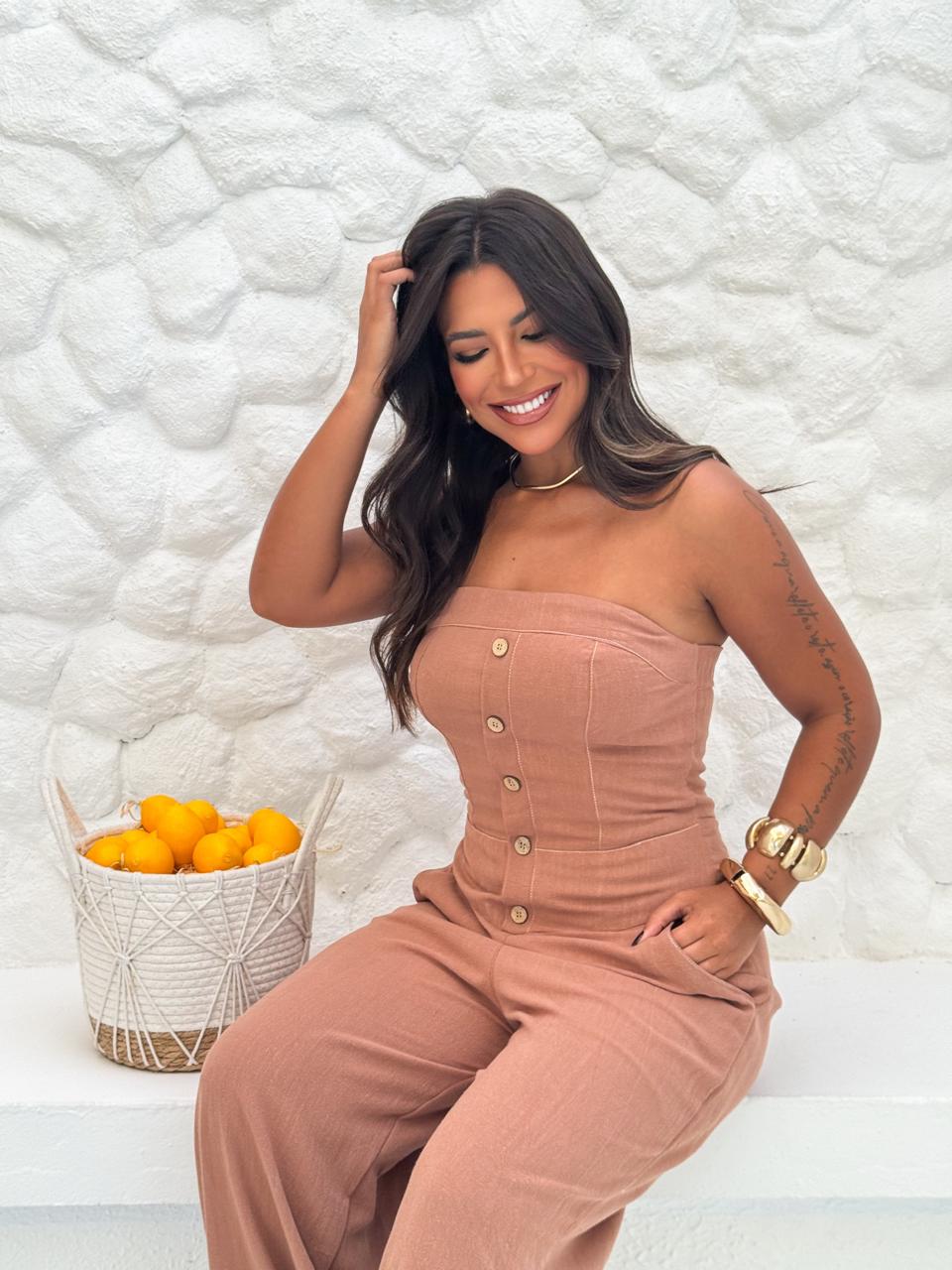 Macacão longo Vancouver 70% viscose e 30% linho , pespontado com linha na tonalidade diferente , recortes , patê com botões e bolso faca