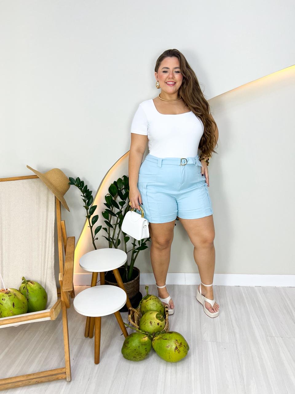 Short de linho com bolsos cargos, zíper, cinto com fivela, recortes e passadores