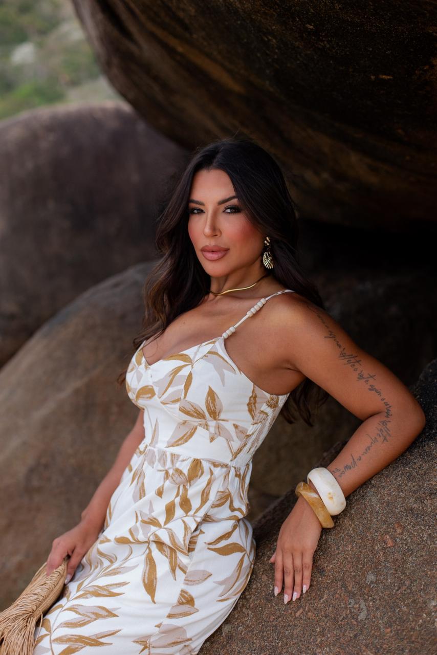 Vestido longo de viscose estampado, com bolsos, babado, alças com regulagem e miçangas e lastex nas costas